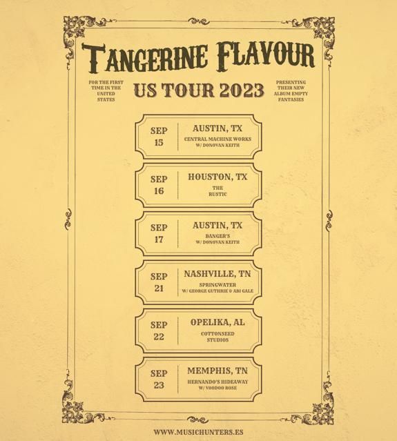 Era cuestión de tiempo que los Tangerine Flavour cruzaran el charco y el momento ha llegado. Tras dos discos y varias giras demostrando su buen hacer en los estilos principales del folklore americano, los madrileños se embarcan en su proyecto más ambicioso: su primera gira por los Estados Unidos que los llevará por algunas de las ciudades más emblemáticas del sur del país, cuna de la música que aman.